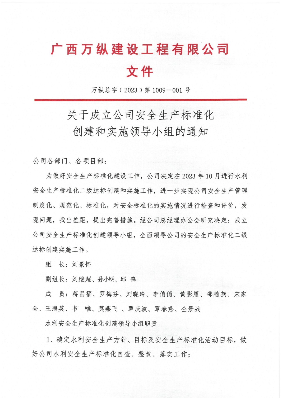 广西万纵建设工程有限公司关于成立公司安全生产标准化创建和实施领导小组的通知
