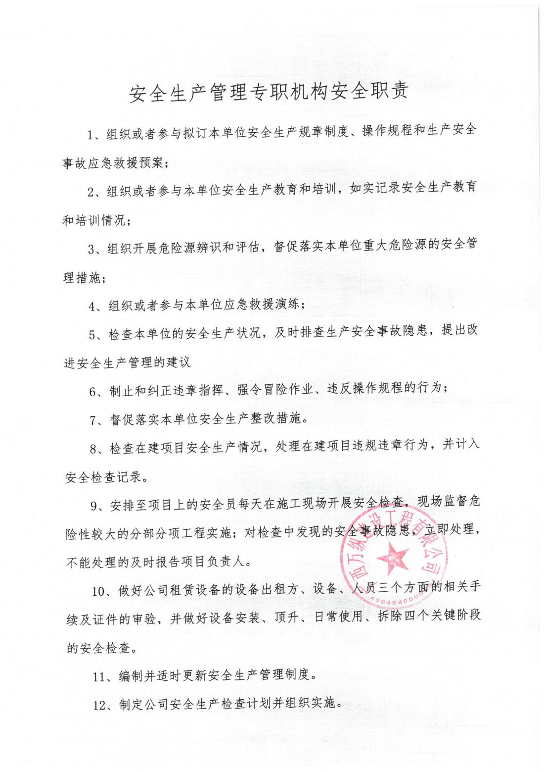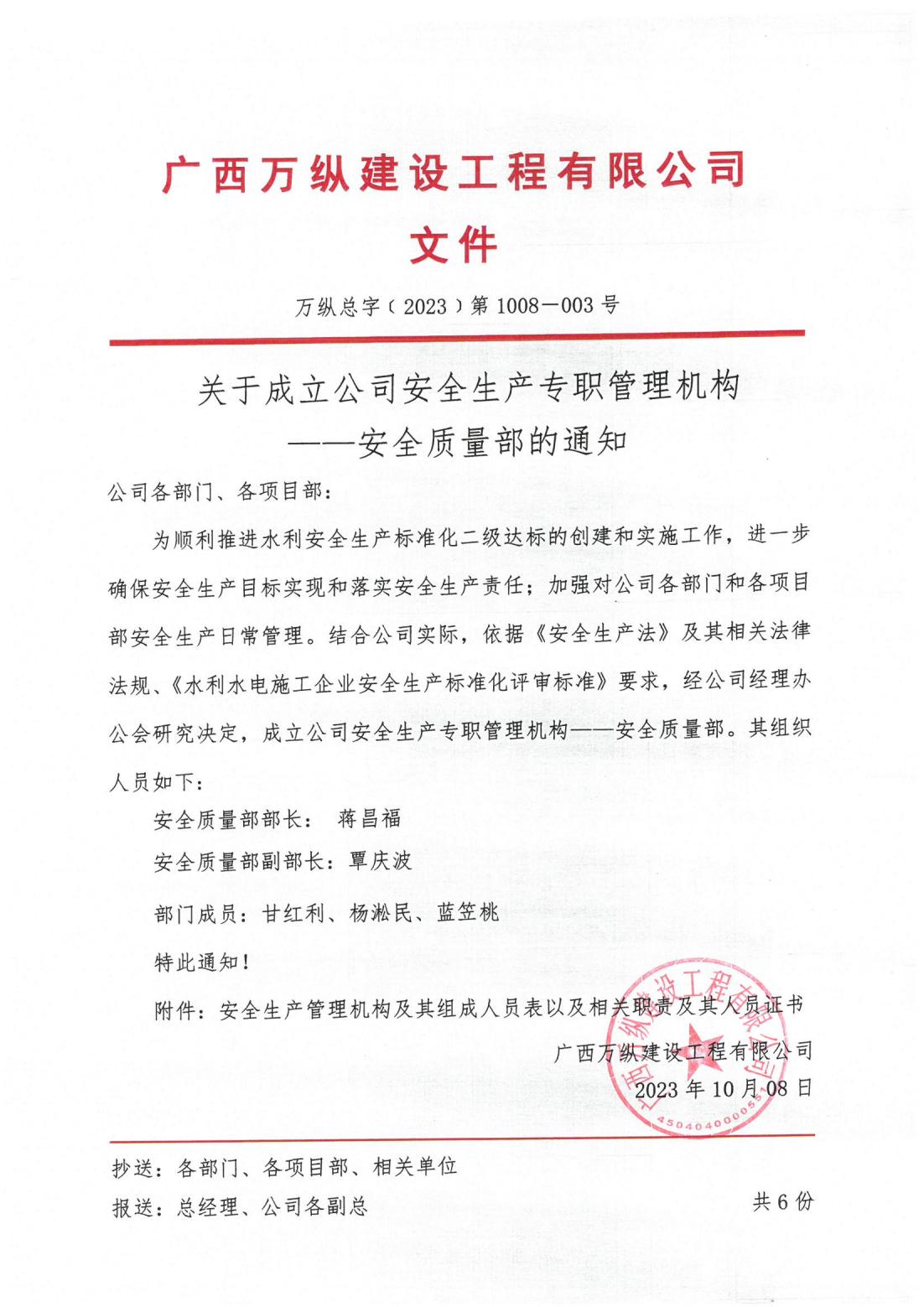 广西万纵建设工程有限公司关于成立公司安全生产专职管理机构——安全质量部的通知