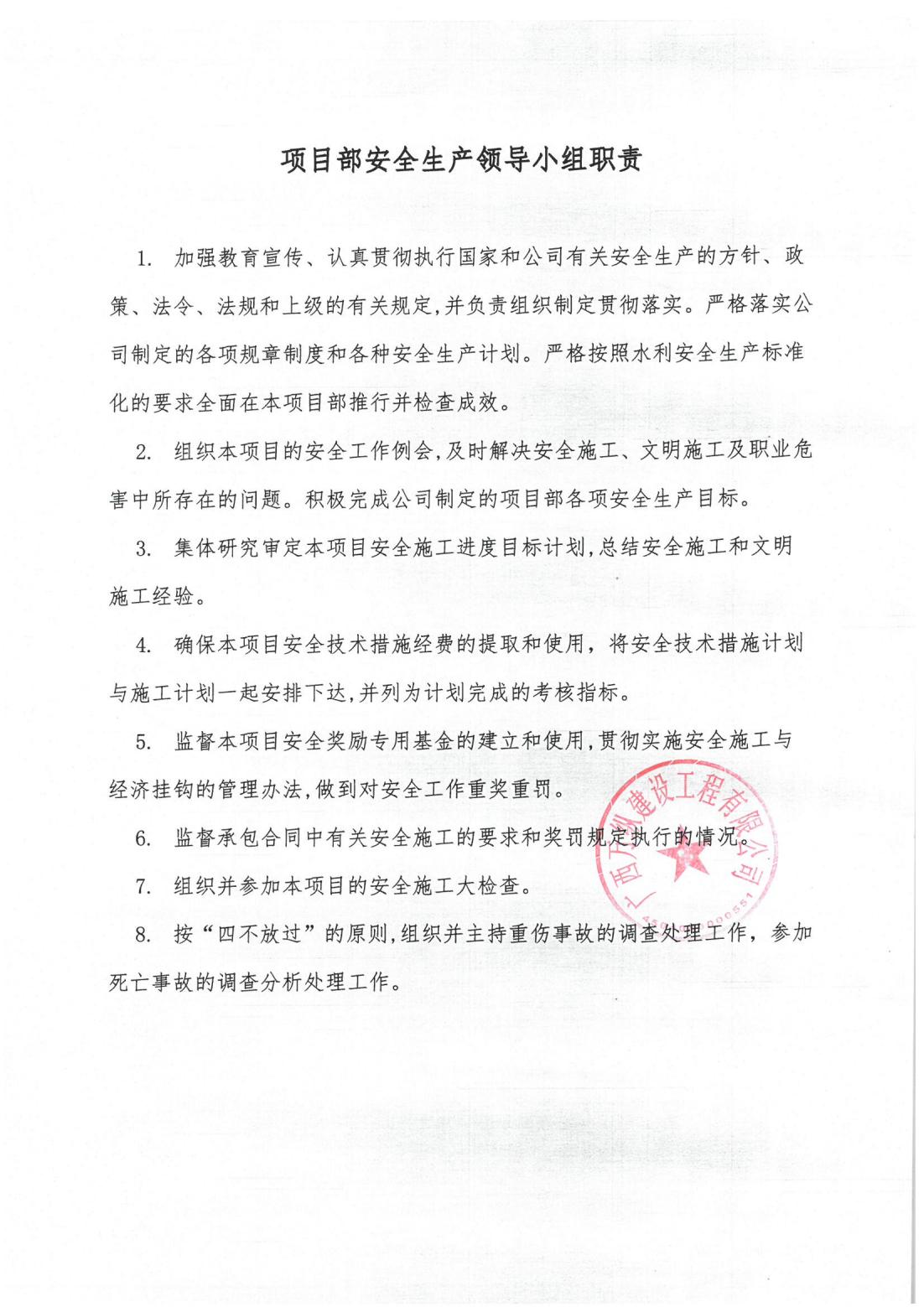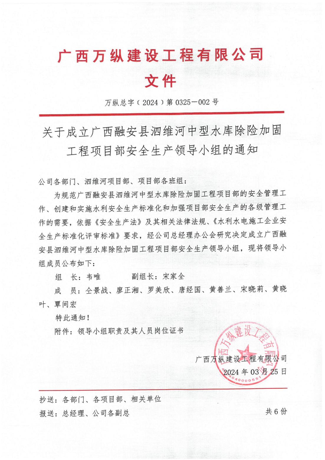 广西万纵建设工程有限公司关于成立广西融安县泗维河中型水库除险加固工程项目部安全生产领导小组的通知