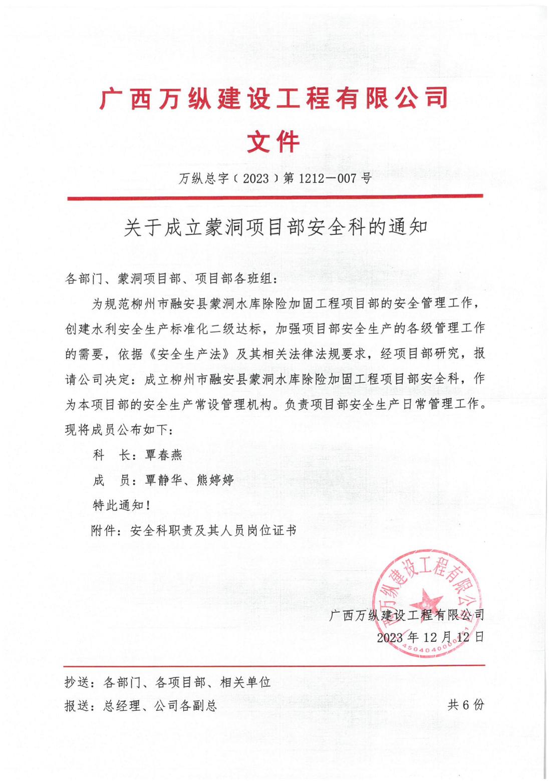 广西万纵建设工程有限公司关于成立蒙洞项目部安全科的通知