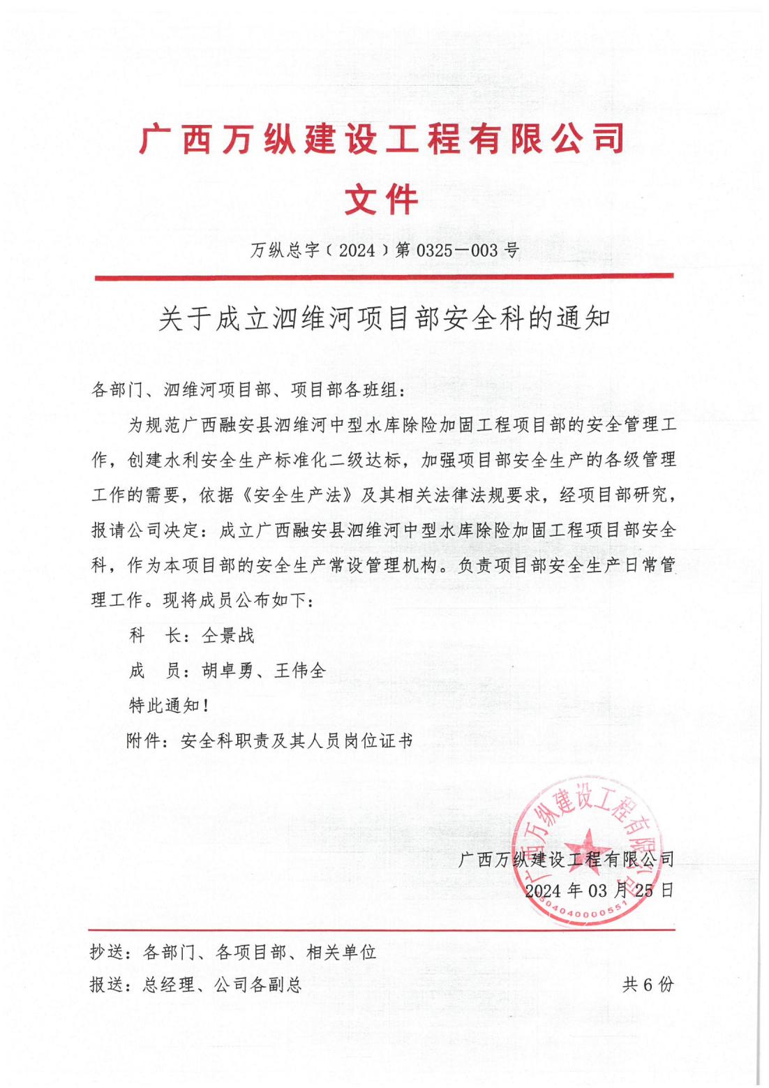 广西万纵建设工程有限公司关于成立泗维河项目部安全科的通知