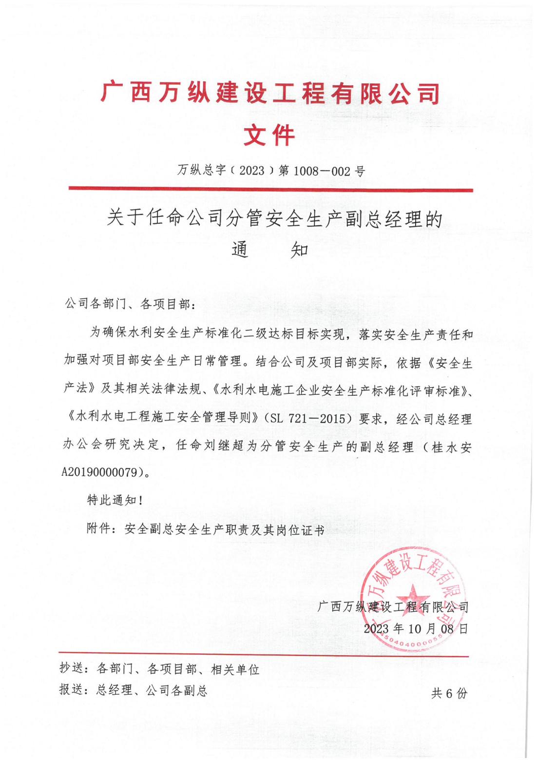 广西万纵建设工程有限公司关于任命公司分管安全生产副总经理的通知