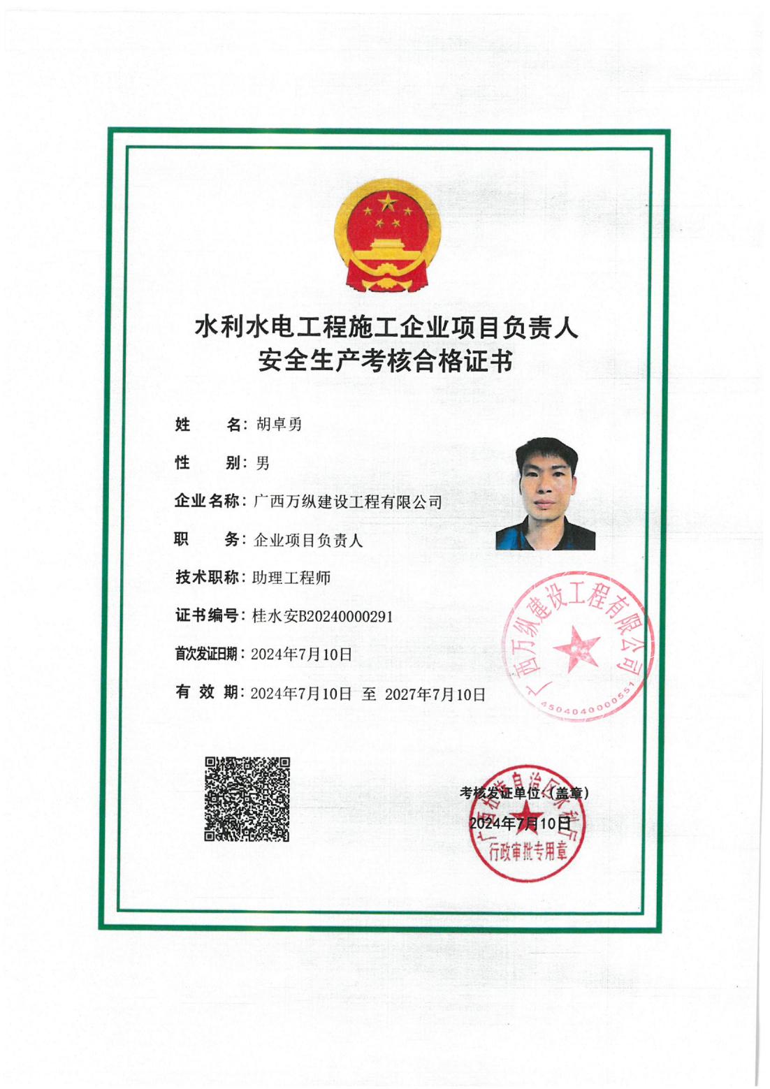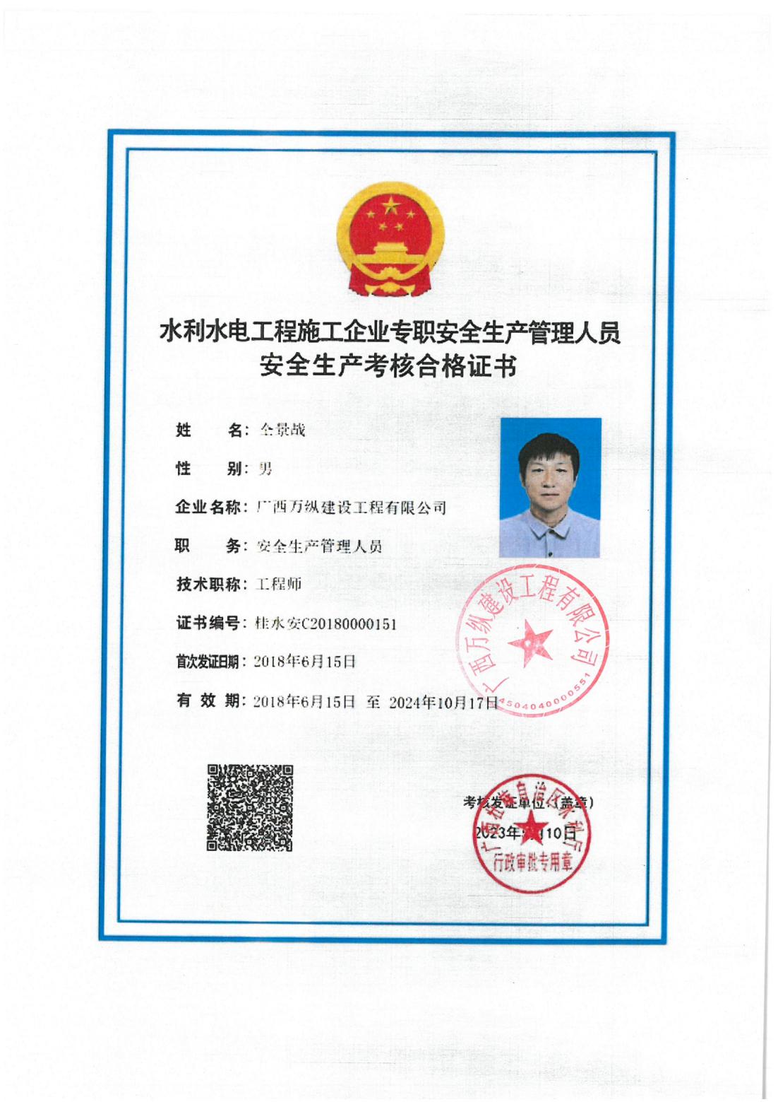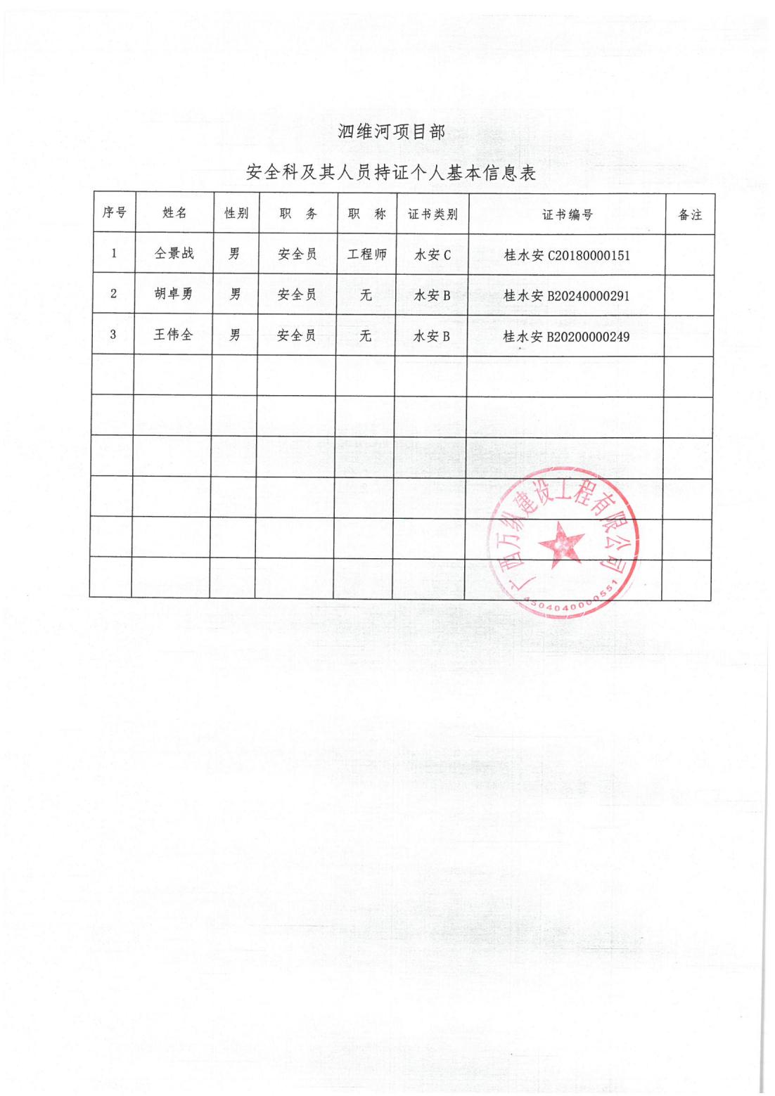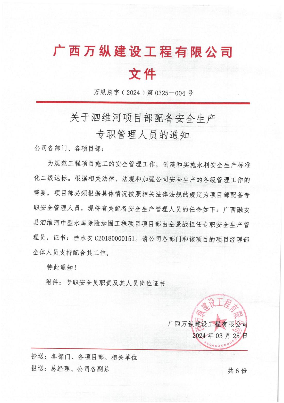 广西万纵建设工程有限公司关于泗维河项目部配备安全生产专职管理人员的通知