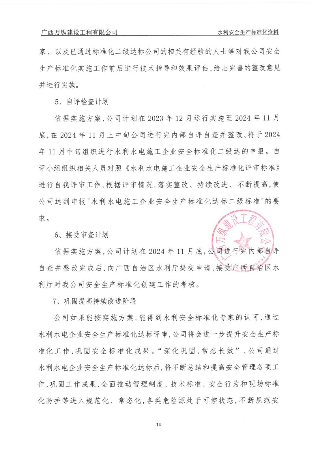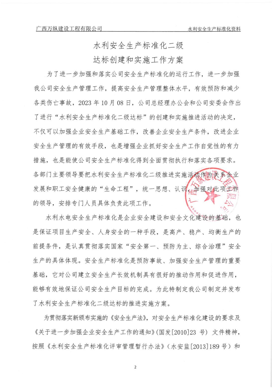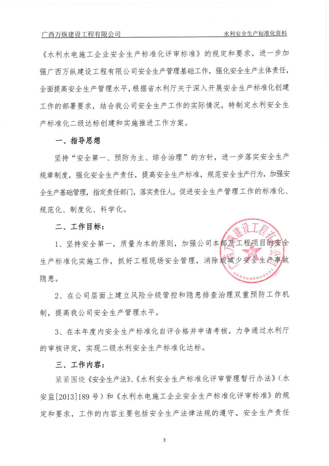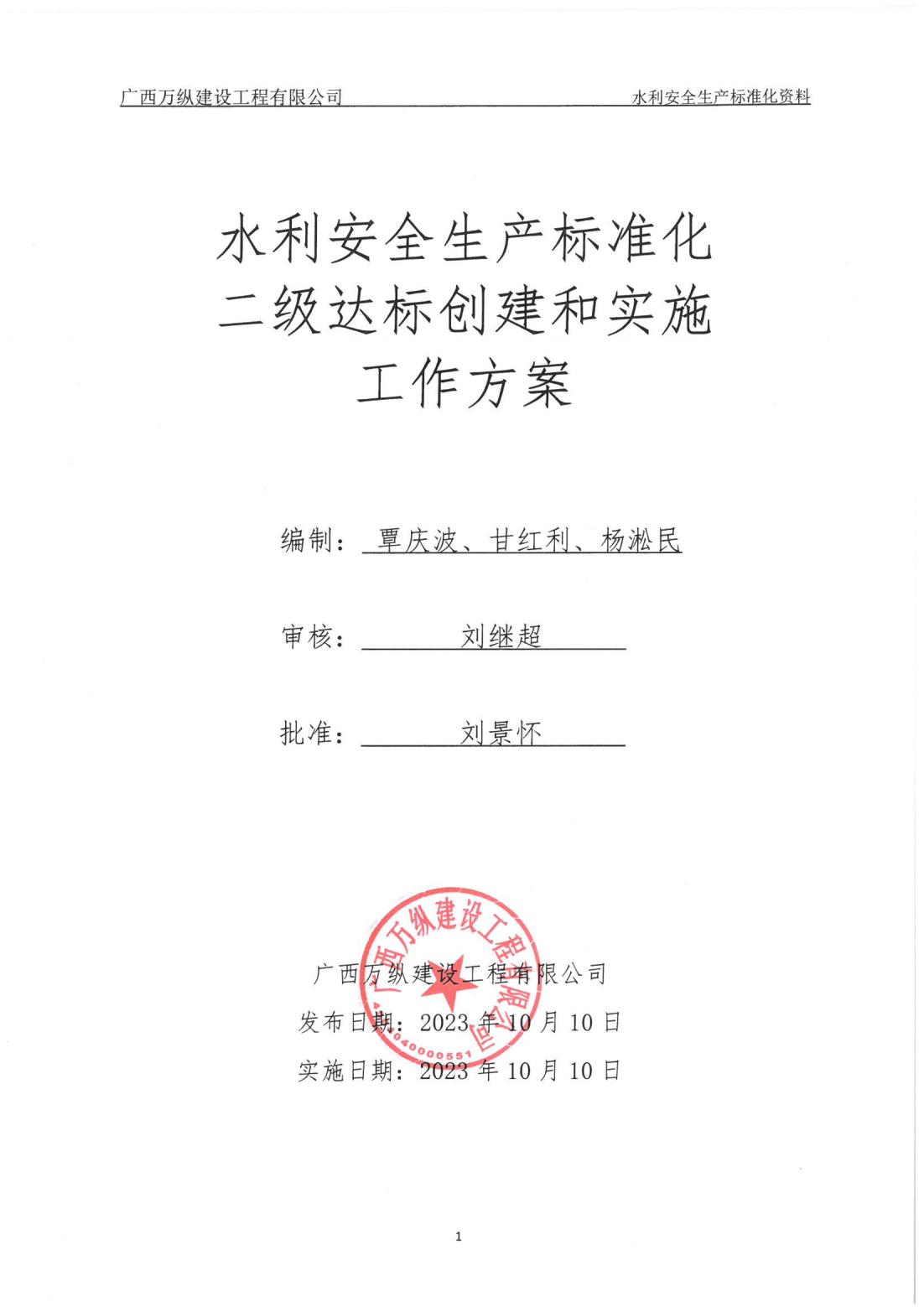 广西万纵建设工程有限公司水利安全生产标准化二级达标创建和实施工作方案