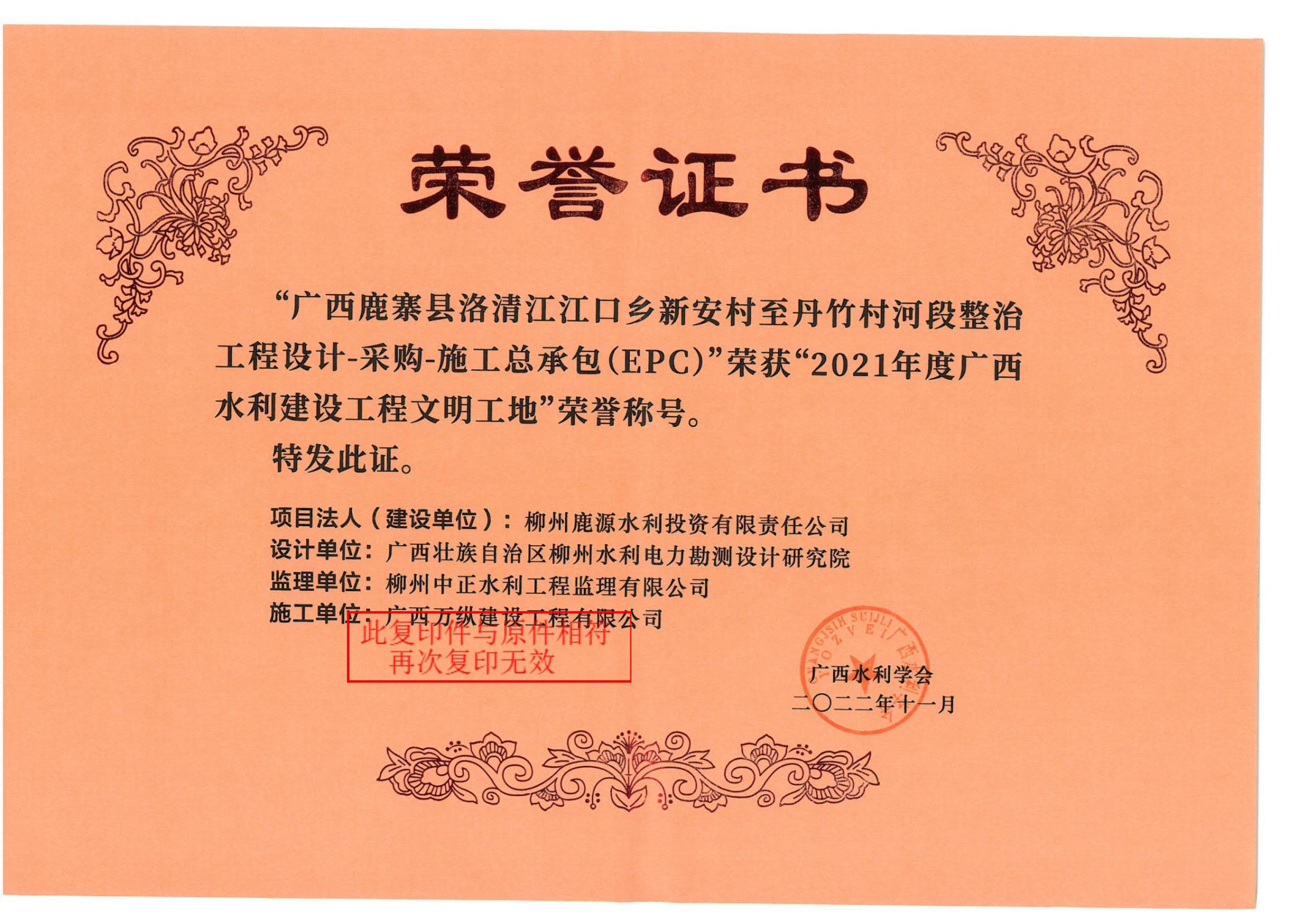 广西鹿寨县洛清江江口乡新安村至丹竹村河段整治工程设计-采购-施工总承包(EPC)文明工地证书