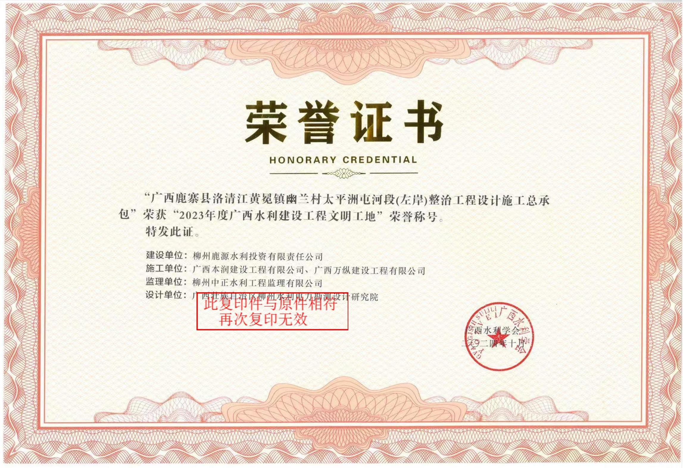 广西鹿寨县洛清江黄冕镇幽兰村太平洲屯河段(左岸)整治工程设计施工总承包文明工地证书